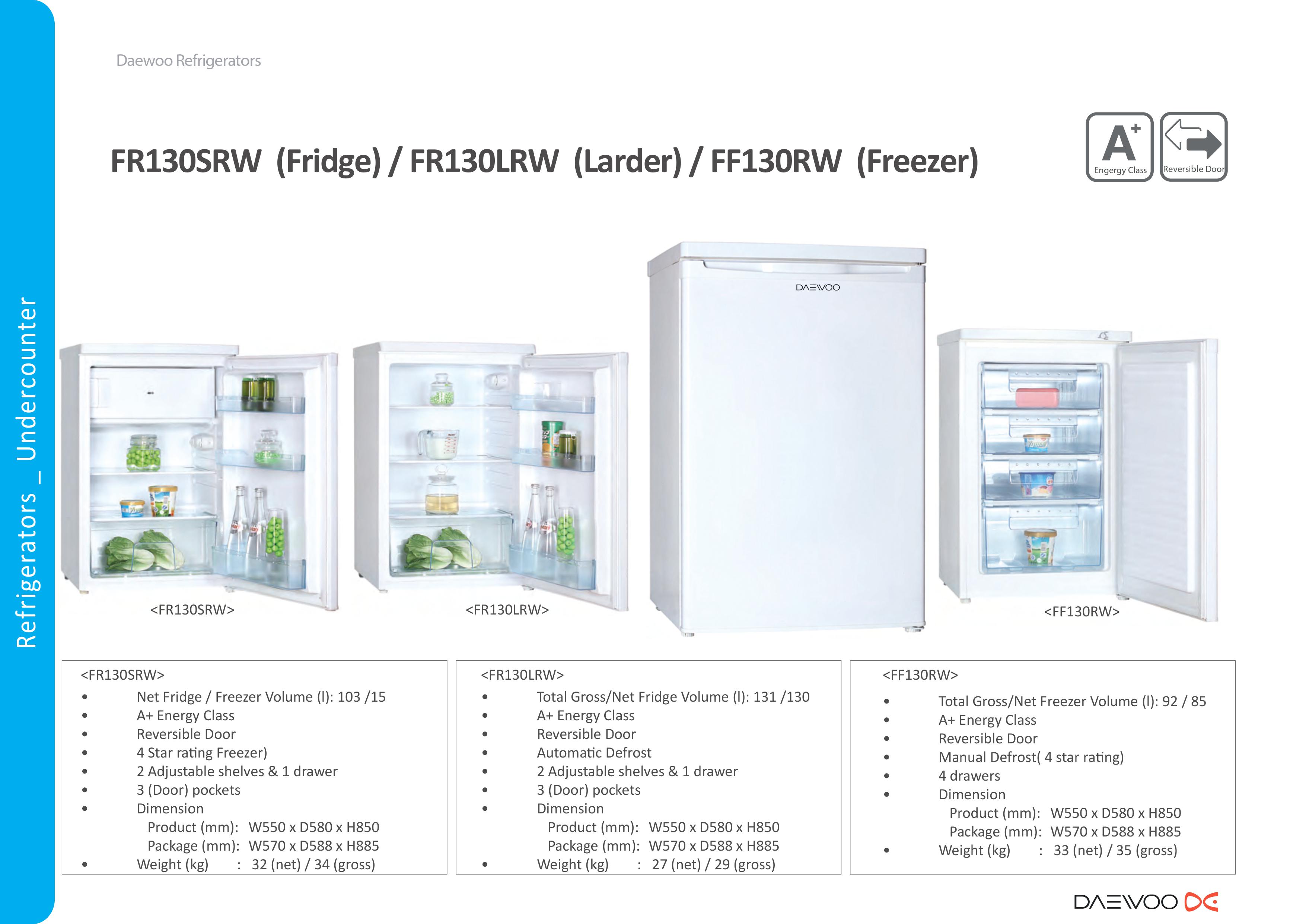 Model No. FR130LRW Colour White Energy Efficiency A+ Product Dimension (W*H*D) (mm) 550 * 850 * 580 Product Weight 27kg Noise Level 41 dB NET Capacity (Total) 130 Litre NET Capacity (Fridge) 130L Packaging Dimension (W*H*D) (mm) 570 * 885 * 588 Packed Weight 29kg - Downloads