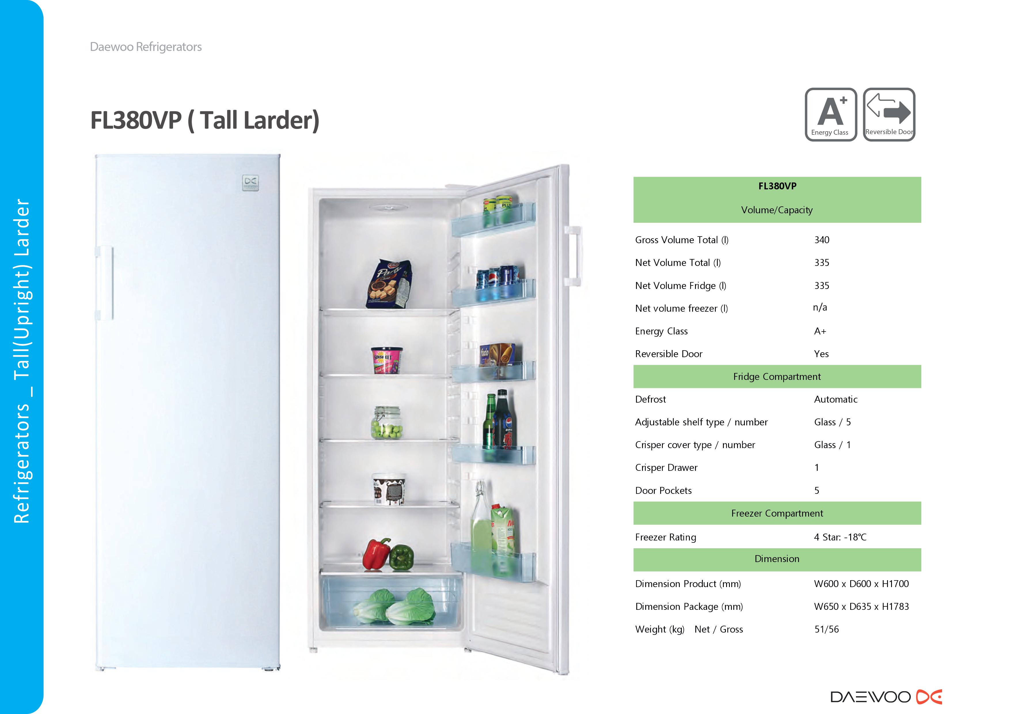 Model No. FL380VP Colour White Energy Efficiency A+ Product Dimension (W*H*D) (mm) 600 * 1700 * 600 Product Weight 51kg Noise Level 42 dB NET Capacity (Total) 335 Litre NET Capacity (Fridge) 335 Packaging Dimension (W*H*D) (mm) 650 * 1783 * 635 Packed Weight 56kg - Downloads