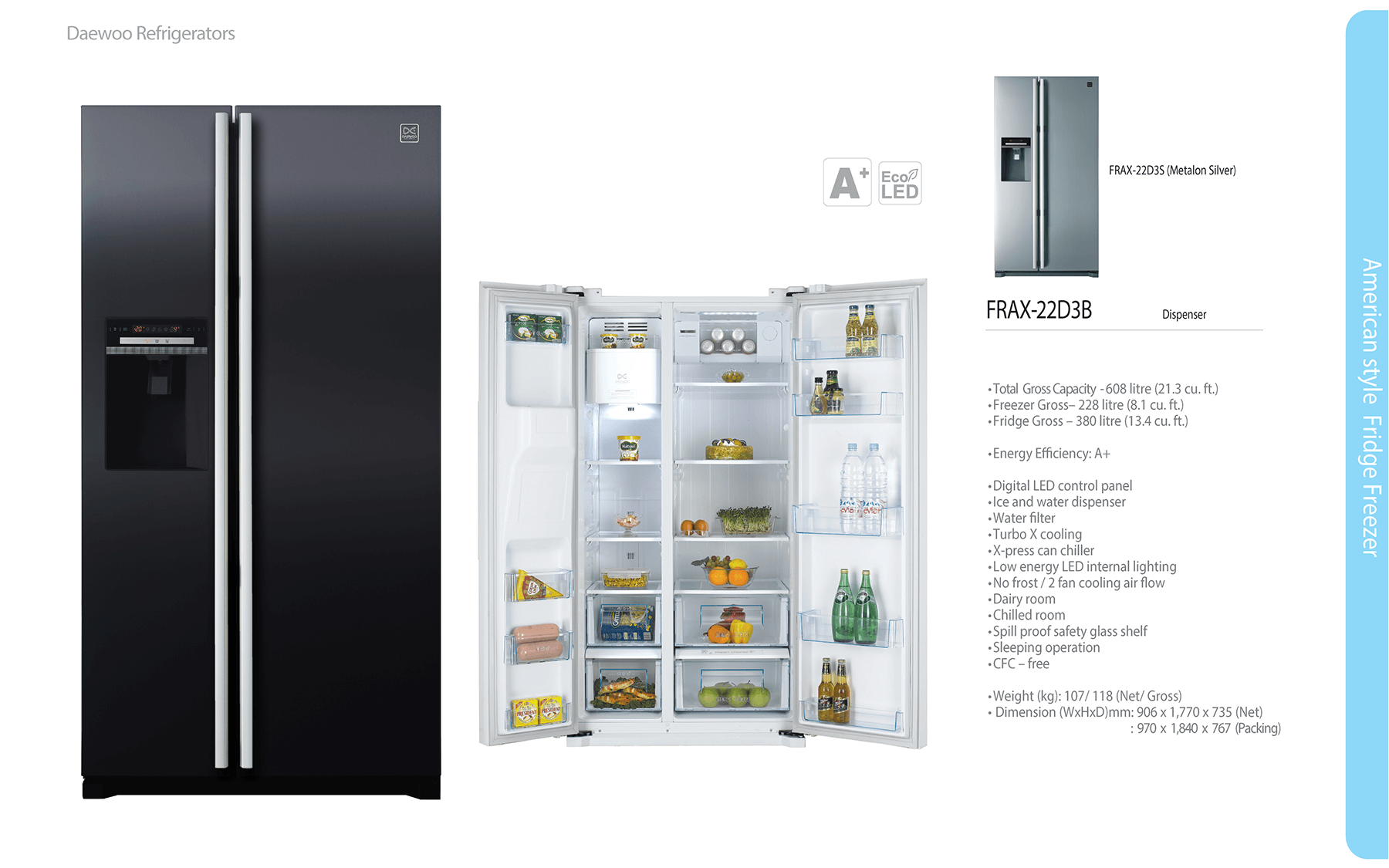 Model No. FRAX22B3B Colour Black Energy Efficiency A+ Product Dimension (W*H*D) (mm) 906*1770*735 Product Weight 98kg Noise Level 41 dB(A) NET Capacity (Total) 577 Litre NET Capacity (Freezer) 204 Litre NET Capacity (Fridge) 373 Litre Packaging Dimension (W*H*D) (mm) 970*1840*767 Packed Weight 113kg - Downloads