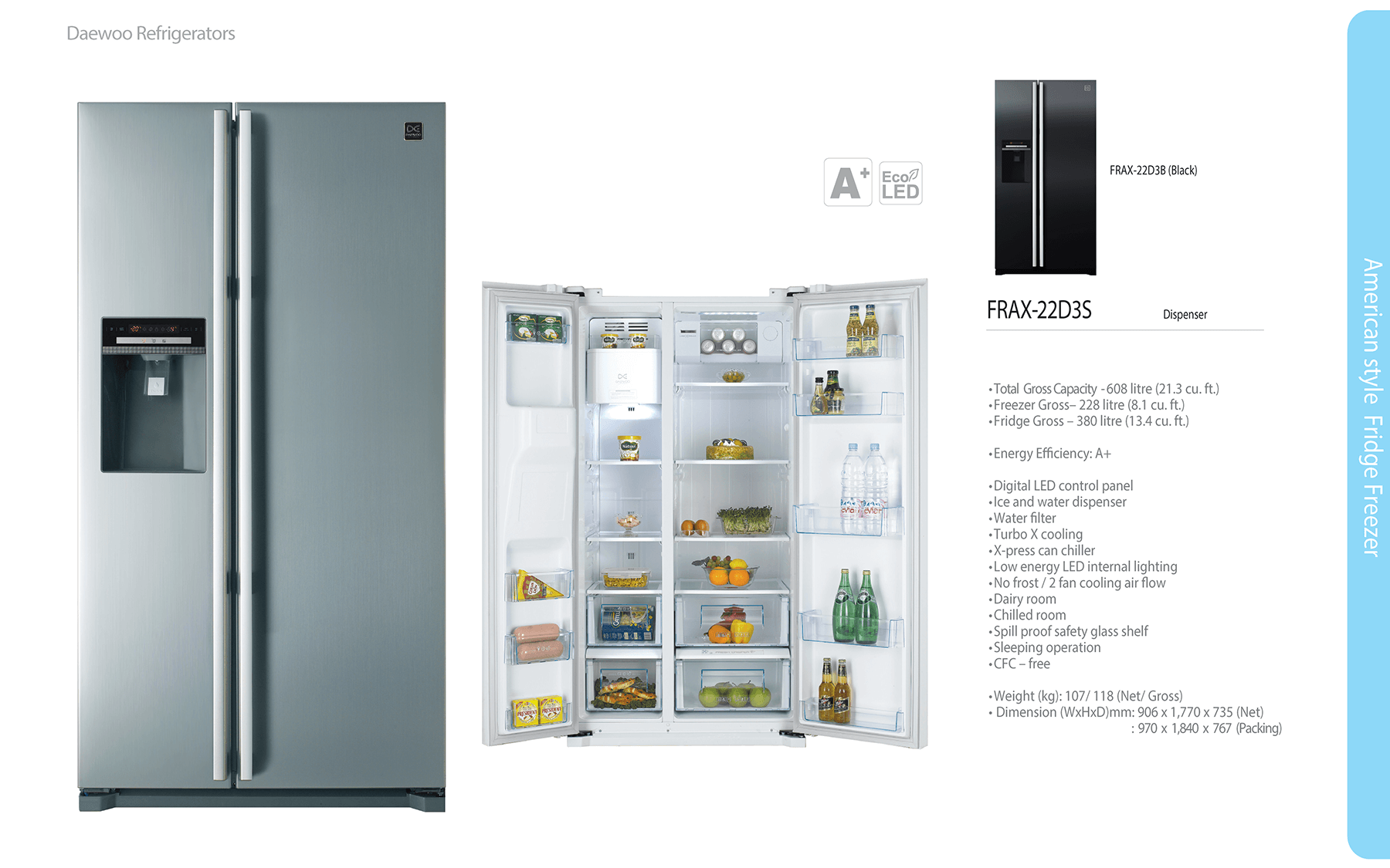 Model No. FRAX22B3S Colour Metalon Silver Energy Efficiency A+ Product Dimension (W*H*D) (mm) 906*1770*735 Product Weight 98kg Noise Level 41 dB(A) NET Capacity (Total) 577 Litre NET Capacity (Freezer) 204 Litre NET Capacity (Fridge) 373 Litre Packaging Dimension (W*H*D) (mm) 970*1840*767 Packed Weight 113kg - Downloads