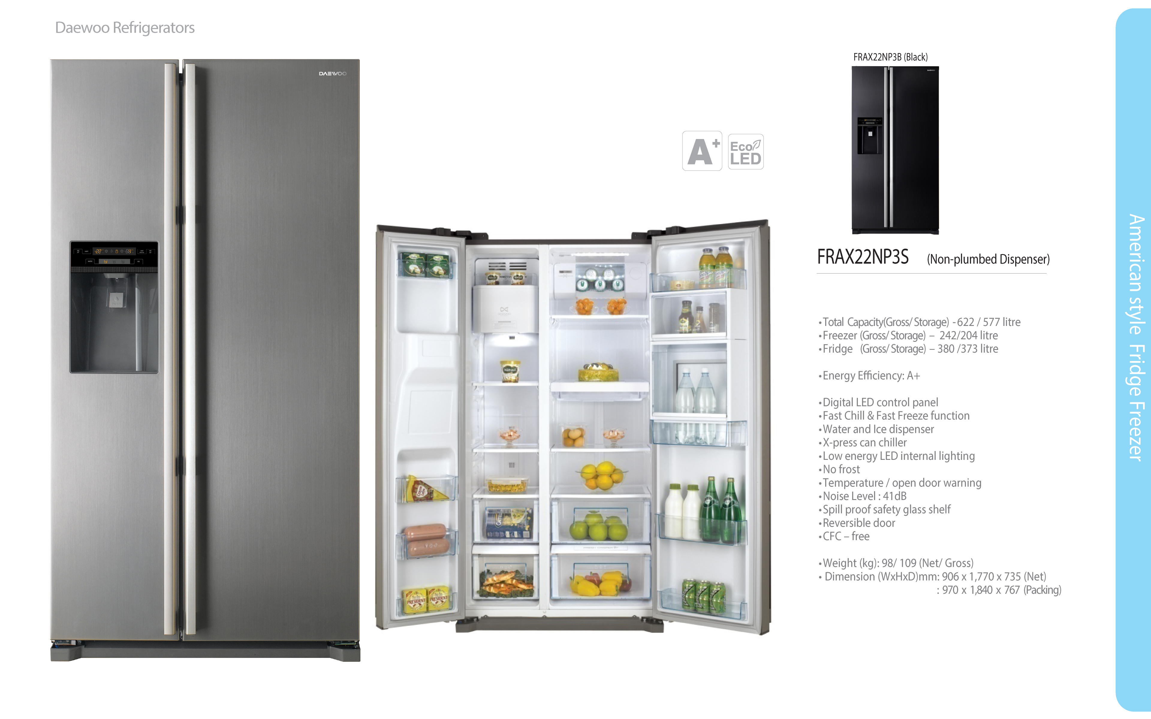 Model No. FRAX22NP3S Colour Metalon Silver Energy Efficiency A+ Product Dimension (W*H*D) (mm) 906 * 1,770 * 735 Product Weight 98 kg Noise Level 41 db NET Capacity (Freezer) 179 Litre NET Capacity (Fridge) 370 Litre Packaging Dimension (W*H*D) (mm) 970 * 1840 * 767 Packed Weight 111 - Downloads